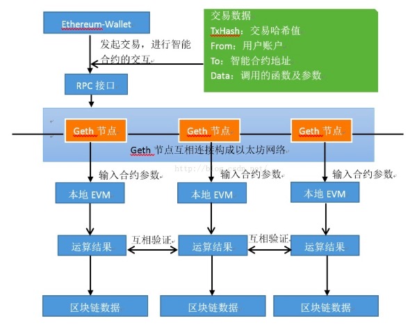 1. 区块链上的用户进行交易 2. 调用智能合约接口验证交易 3. 验证成功后发布到其他节点