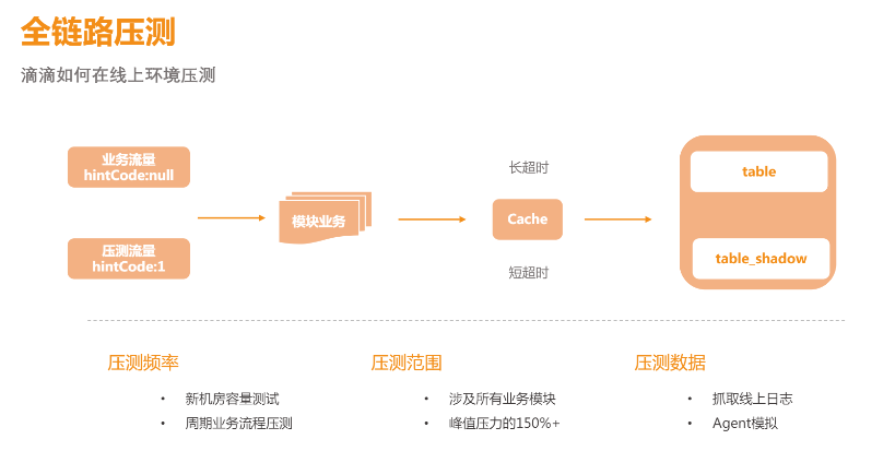 1. 流量标识,对压测流量 req header 添加 hitcode 2. 快cache+影子表 3. 写agent模拟操作,系统黑盒(非函数式状态,司机、乘客、天气等)