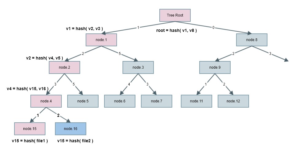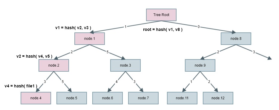 Merkle Tree 可以为二叉树或多叉树 叶子节点记录文件信息,非叶子节点记录其子节点的hash 如图,hash( file1 ) = 1, 2, 3